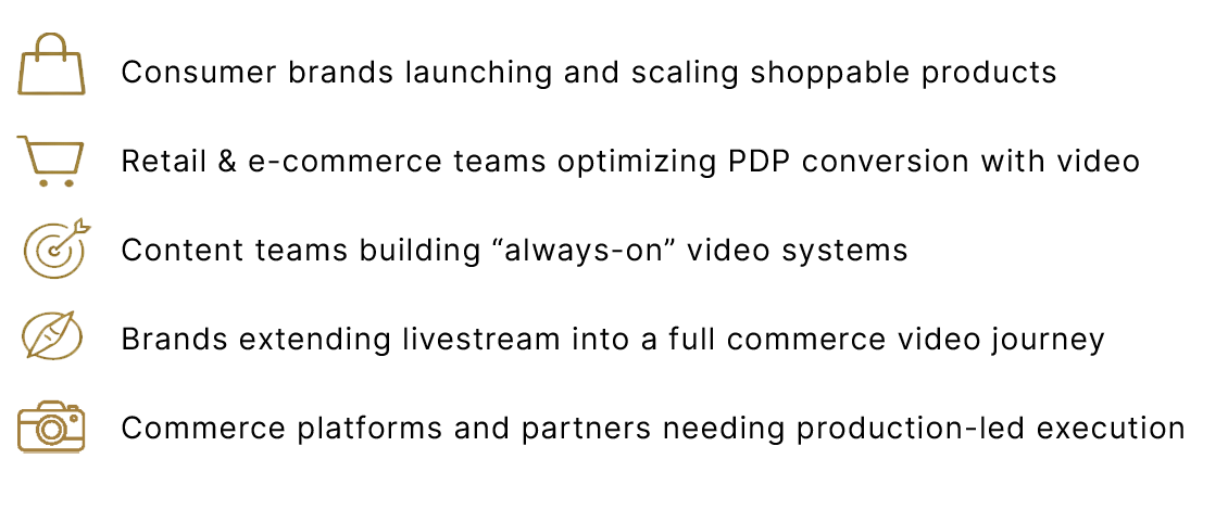 Live, shoppable, and short-form video designed to work together — not in isolation.